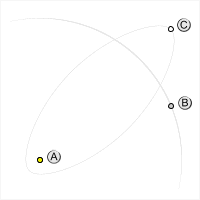 L'animation ci-contre représente l'apparition de la queue de la comète (C) lors de son passage près de l'étoile (A). L'objet (B) est la représentation d'une planète naine comme Pluton aux confins du système solaire.